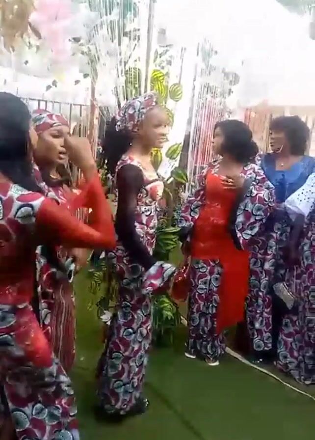 group of women dancing at an outdoor event. They are dressed in brightly colored, patterned dresses and headscarves. Some of the women are wearing red dresses with a matching headscarf, while others are wearing dresses with a blue pattern. The women are smiling and appear to be enjoying themselves. The event appears to be taking place under a tent, decorated with white draping and floral arrangements. There are tables and chairs in the background. Some people can be seen sitting at the tables in the background. Someone is holding a phone, recording the group as they dance.