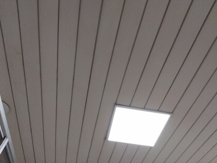 The image presents an overhead view of an indoor ceiling. The ceiling consists of light grey, textured, rectangular panels with darker linear grooves between them, running diagonally from the lower left to the upper right of the frame. A single, illuminated square LED panel light is recessed into the ceiling in the lower right area, emitting bright white light. On the far left edge, a partial white circular fixture is visible, alongside a section of a metallic grey frame and a dark surface below it, consistent with a window or door assembly. No people, actions, or interactions are visible. The depicted location is Shaba, Nigeria.