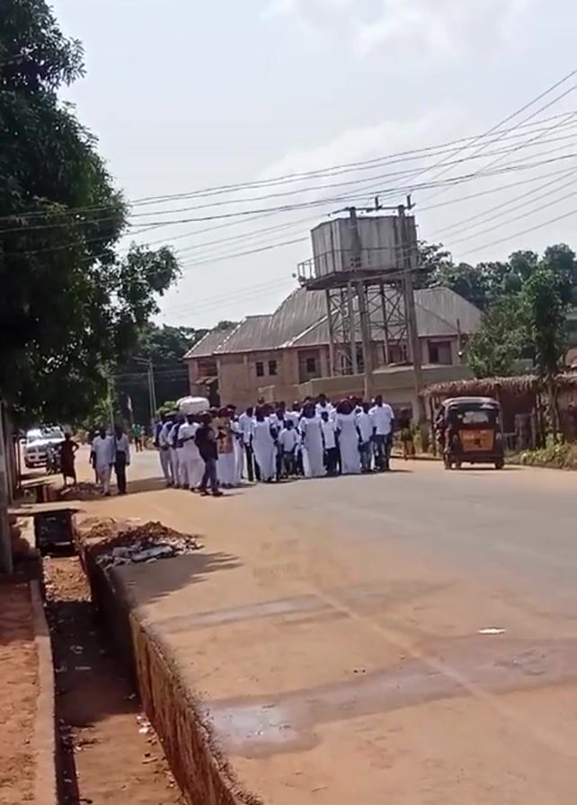group of people walking down a road. Most of them are wearing white robes and shirts, with some individuals in black. A white van is visible in the group. On the side of the road, there's a three-wheeled vehicle, and a motorcycle is also seen in motion. In the background, there's a water tower and some buildings. The sky is partly cloudy. There's a ditch running along the side of the road. A car is parked on the left side of the road. The footage appears to be handheld and slightly shaky. The people walking seem to be part of a procession or march, accompanied by the sound of music.