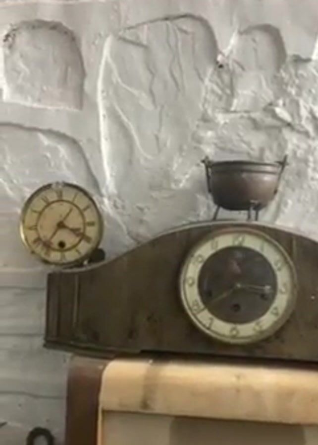 The camera pans across a collection of antique items arranged against a white, textured wall that resembles stonework. The first item is a round clock with a tarnished golden frame and Roman numerals, sitting atop a wooden cabinet. Next to it, a small, tarnished copper pot with three legs rests on the cabinet. A second clock, slightly larger and built into the wooden structure of the cabinet, features a circular face with simple gold numerals. The cabinet itself appears to be an old radio, with a mesh speaker cover and dark paneling. The whole arrangement conveys a sense of age and antiquity.