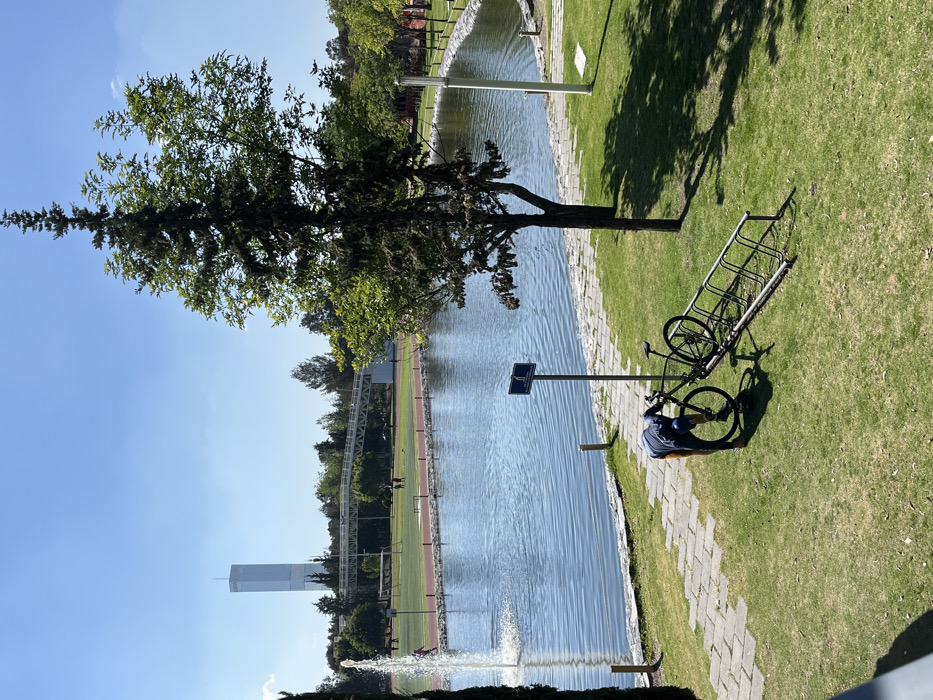 A tranquil scene unfolds beside a canal-like body of water. A tree's foliage overhangs the water's edge. A bicycle leans against a rack on a grassy bank. A person is present near the bicycle. In the background, a running track is visible, flanked by a metallic structure. In the distance, a tall building stands prominently against a clear sky. A fountain sprays water into the air near the foreground. The image is taken outdoors in daylight.