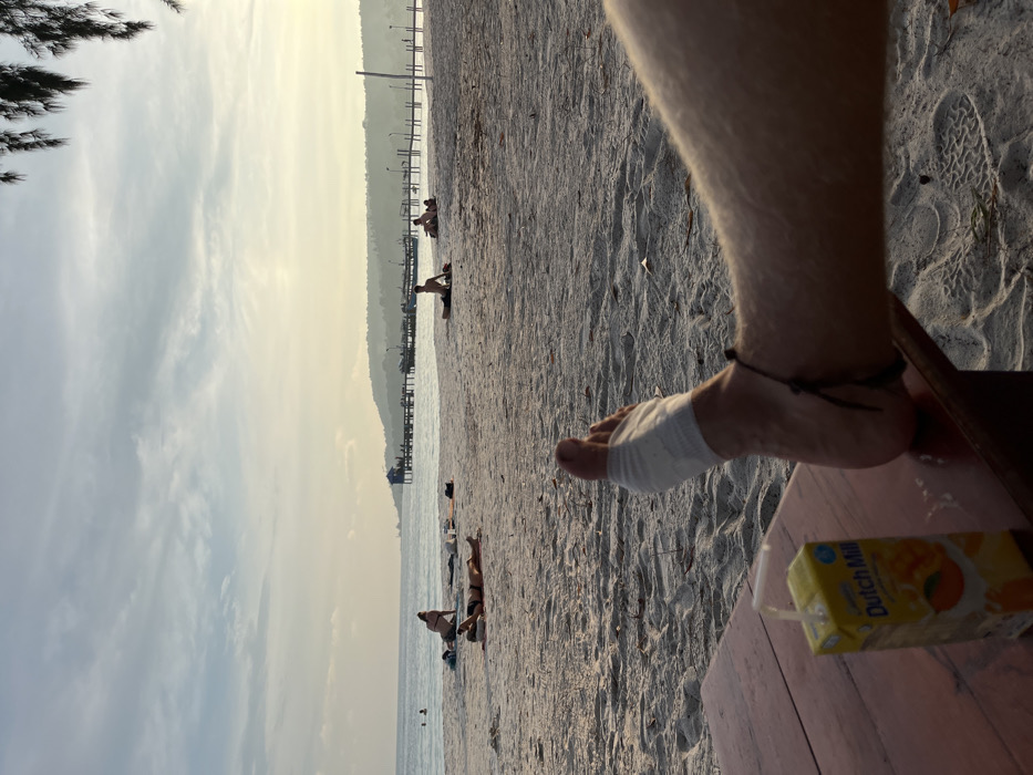 The image depicts a coastal scene at a beach in Preah Sihanouk, Cambodia, likely during late afternoon or early morning, indicated by the warm light near the horizon. In the immediate foreground, a person's fair-skinned right leg is visible, with the foot resting on a reddish-brown wooden surface. The right foot has white bandaging wrapped around the toes and top of the foot, and a black string or anklet is around the ankle. Next to the foot on the wooden surface is a small, yellow and orange "Dutch Mill" mango juice carton with a straw inserted. The midground features a sandy beach with several individuals relaxing. One person in a dark swimsuit lies supine on the sand with arms behind their head. Another person in a dark swimsuit sits upright, facing the sea. Further to the right, a person is seated on the sand, facing the water. Additional faint figures are visible on the beach and in the water. In the background, calm, light blue sea stretches to the horizon. A long wooden pier or jetty extends into the water from the right side, with multiple small structures or boats docked alongside it. A small building is visible at the pier's end. Beyond the water and pier, a tree-covered landmass or hills line the distant horizon. The sky is partly cloudy, transitioning from a light blue overhead to a golden-yellow hue near the horizon. Dark foliage, resembling pine needles, hangs into the top right corner of the frame.