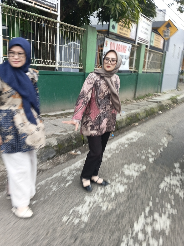 Two women stand on a street with a building and fence in the background. The woman on the left wears a navy blue hijab, patterned top, and white pants. The woman on the right wears a brown hijab, patterned top, and black pants. Both are wearing glasses. The street is paved and has a pattern on it. The photo is slightly blurry and appears to be taken while in motion.
