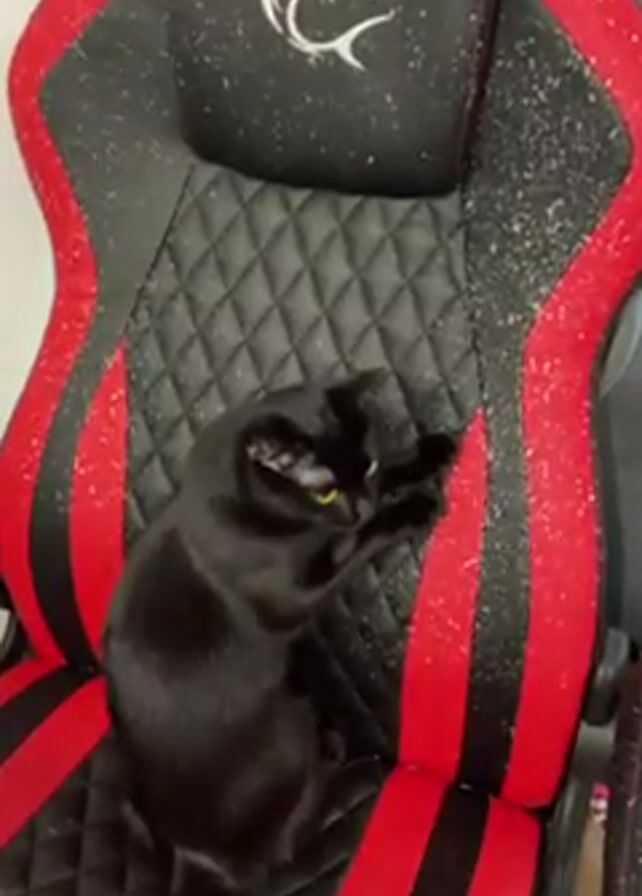 black cat sitting in a black and red gaming chair. The chair has a diamond-patterned seat and a logo of a shark on the headrest. There is debris, possibly cat hair or skin flakes, scattered on the chair. The cat initially sits upright, then looks up directly at the camera with bright yellow eyes. The camera moves slightly downwards towards the cat at the end.