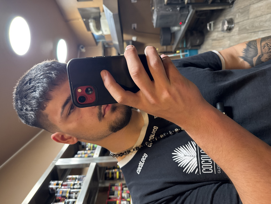 An indoor scene within a commercial establishment, specifically identified as a COCOLOCO Shisha Lounge in Sofia, Bulgaria, is depicted. A young adult male, exhibiting a fade haircut and a trimmed beard, occupies the foreground. He is holding a black smartphone, featuring a visible red camera module, directly in front of his face, obscuring it partially. He wears a black t-shirt with white collar trim and "COCOLOCO GLOBAL" branding, a dark beaded necklace, and a visible tattoo on his left forearm depicting a stylized lion. To the subject's left, a multi-tiered metal shelving unit is stocked with numerous cylindrical, branded product containers, consistent with shisha tobacco. To the subject's right, a work area features a stainless steel exhaust hood mounted above a counter. A security camera is visible on the upper right wall. On the counter, a dark-colored appliance, likely a charcoal burner, displays an illuminated red indicator light. The ceiling has recessed circular lights, and the walls are a consistent warm brown color.