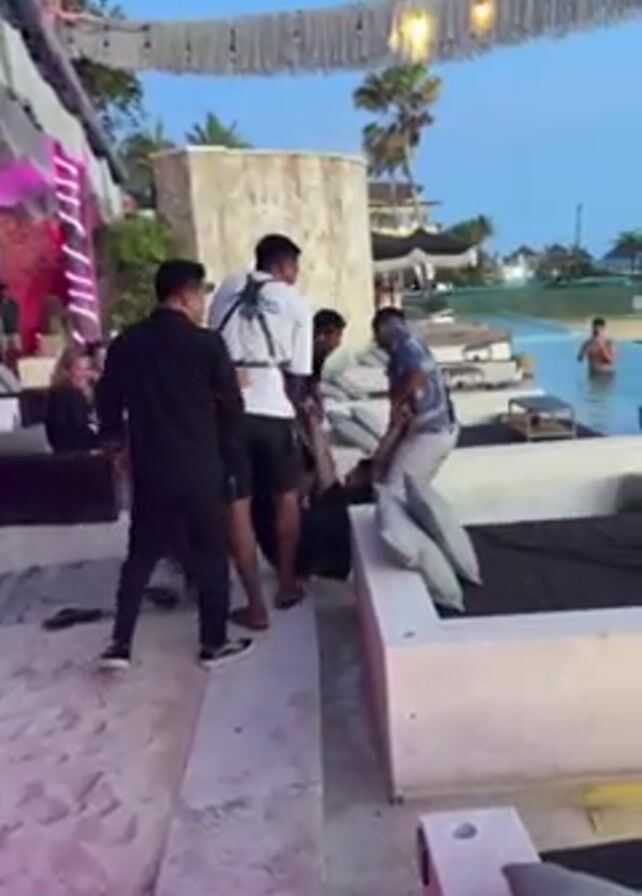 four men placing a man who appears to be resisting, onto a daybed next to a pool. The daybed is white with gray pillows and a black mattress. The pool behind the daybed has a ship-themed sculpture in it, and people can be seen swimming. The surroundings suggest an upscale beach club or resort. There are decorative lights strung overhead. The man being placed on the daybed is wearing a black shirt and pants. The other men are dressed in a variety of casual clothing. Their expressions and body language suggest a mixture of amusement and mild effort. The ground is a combination of concrete and sand.