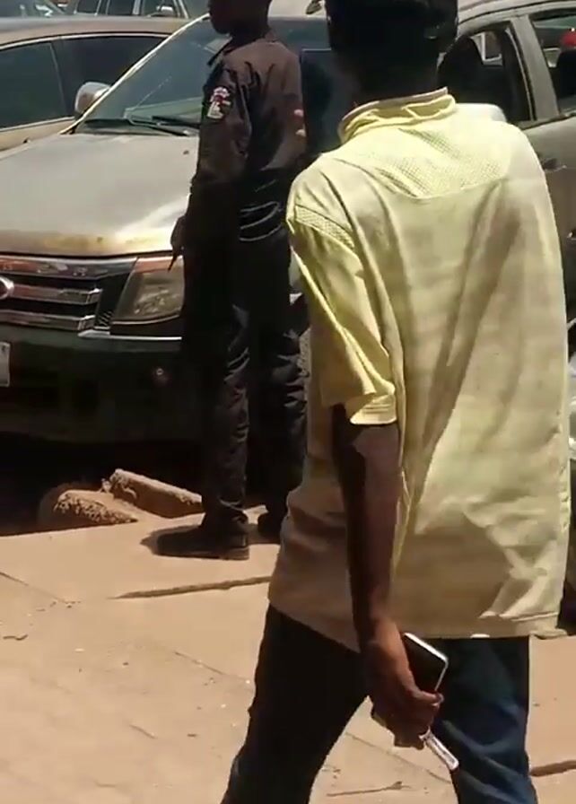 man in a yellow shirt and blue jeans walking away from the camera on a sidewalk next to a street with cars parked. A security guard dressed in a black uniform stands next to a silver pickup truck. A black and red motorcycle is parked next to the truck. The street is lined with buildings. Other cars are parked along the road. The sidewalk is cracked.