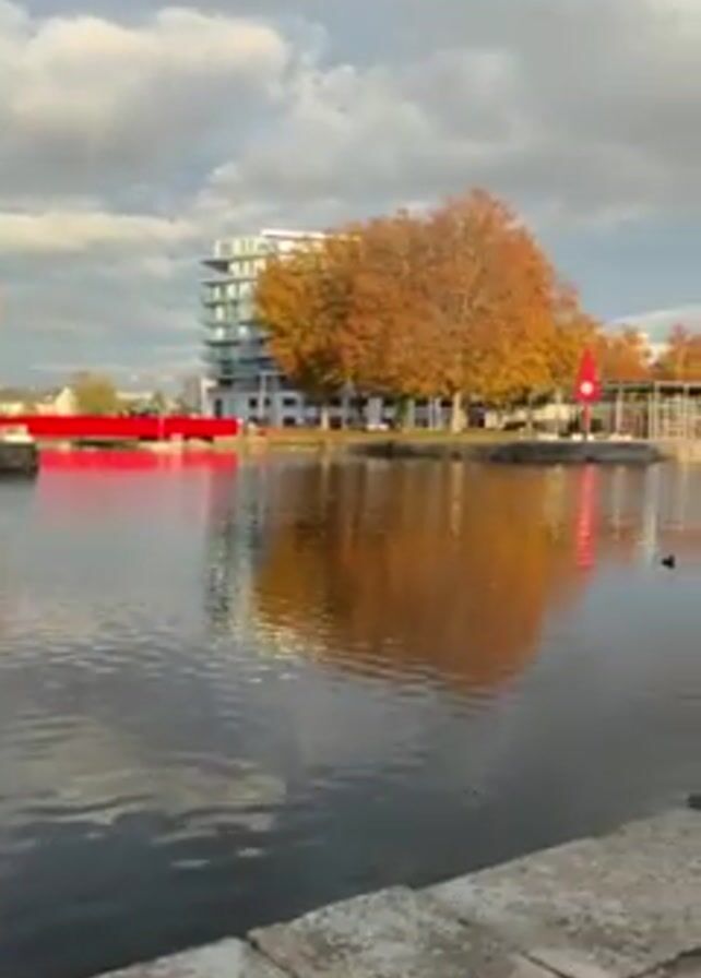 calm river scene under a partly cloudy sky. On the left, a white sailboat is docked alongside a stone quay. Across the water is a modern building and trees with autumn foliage. A bright red bridge spans the river in the distance. The water reflects the trees and sky, creating a mirror-like effect.