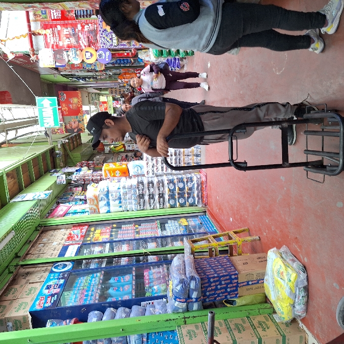 A man wearing a black baseball cap and dark gray shirt pushes a metal cart along a bustling market aisle. Rows of stacked toilet paper and refrigerated goods line the left side. Ahead, two women walk in the opposite direction. One is wearing a gray and black jacket. Colorful advertisements and signs hang from the stalls above.