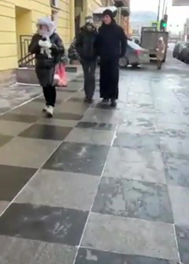 street scene in what appears to be St. Petersburg, Russia, on a partly sunny day. The sidewalk is paved with black and gray tiles. Several pedestrians walk along the sidewalk. A bus stop sign is visible, as are parked cars and a truck on the street. In the distance, an elaborate building with a golden dome can be seen. The street and sidewalk have patches of melting snow and water.
