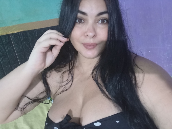 A close-up, front-facing image features a woman with long, dark, wavy hair and brown eyes, looking directly at the camera with a slight smile