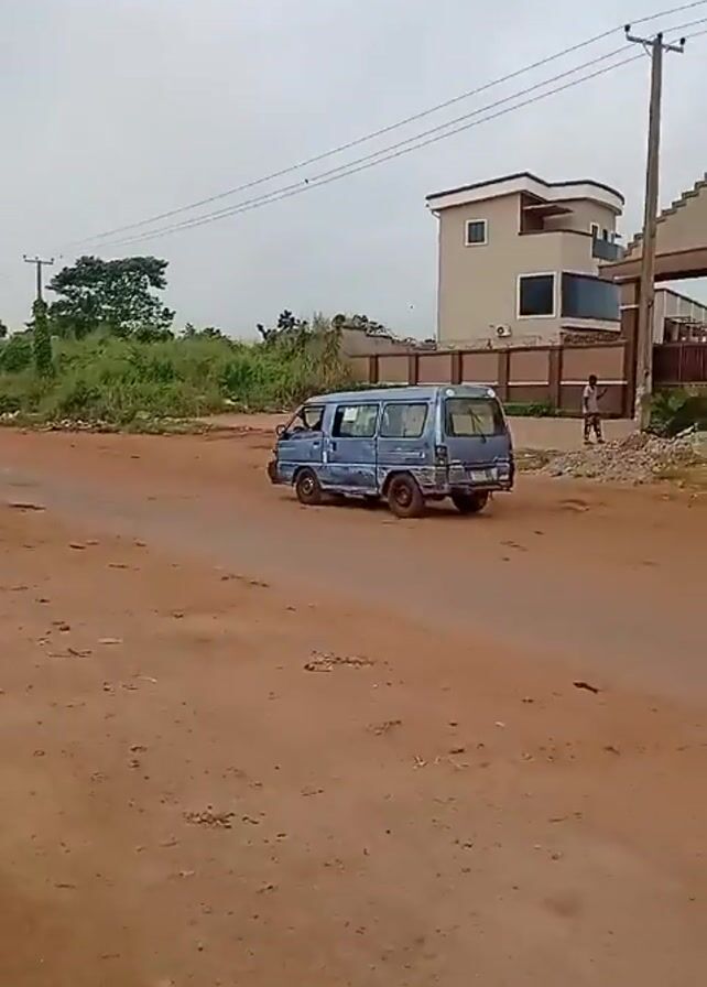 blue van driving away from the viewer on a dirt road. The road is mostly dirt, with some trash scattered along the side. The sky is overcast. There is a building to the right of the frame and vegetation to the left. A person can be seen walking by the side of the road.