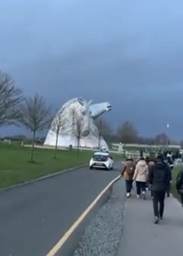 The video depicts a view of The Kelpies sculptures in Scotland under a dark, overcast sky. A small group of people is walking along a paved path next to a road with a white car driving on it. The Kelpies, two large horse-head sculptures, are visible in the background across a grassy field. Bare trees line the field. The overall atmosphere is somewhat bleak due to the weather.