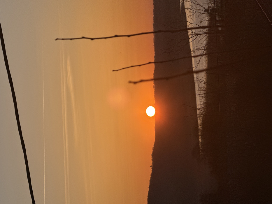 The image displays a sunset over a natural landscape, likely a view overlooking Lake Mandra (Мандренско езеро) or a similar body of water within the municipality of Burgas, Bulgaria, from an elevated position. The upper two-thirds of the frame are dominated by a clear sky exhibiting a warm gradient from light orange-yellow at the top to a deeper orange near the horizon. A dark, horizontal power line or cable spans the top third of the image. Faint, linear contrails are visible in the upper sky, parallel to the horizon. The sun, a bright, circular, white-orange orb, is positioned centrally-left, resting on the silhouetted horizon line of distant hills or a densely forested area. Below this horizon, a body of water reflects the sky's light, appearing silvery-blue with ripples. The foreground consists of dark, out-of-focus vegetation, including several prominent bare tree branches silhouetted against the bright sky and water, and what appears to be a low fence or horizontal wire spanning the lower midground. No discernible people, specific actions, or interactions are visible.