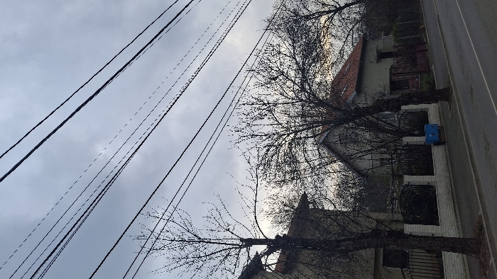 The image depicts a residential street scene in Sofia, Bulgaria, under an overcast sky. Multiple dark electrical or utility lines traverse diagonally across the upper portion of the frame. In the midground, several bare deciduous trees with dark branches stand prominently, suggesting late autumn or winter. Two houses are visible: one partially on the far left, a light-colored structure with an unseen roof; and a more complete view of a second, two-story, light-colored house with a reddish-brown tiled gabled roof situated towards the right-center. This house features dark window frames and is partially obscured by trees. A low white brick wall topped with black wrought-iron fencing runs horizontally across the lower midground, separating the properties from the public thoroughfare. A blue, rectangular utility box or container rests on the sidewalk adjacent to the fence, positioned to the right of a foreground tree. The foreground features a paved asphalt road, appearing damp, with a visible white curb line running parallel to the fence. No individuals, overt actions, or interactions are discernible in the scene. The overall lighting is subdued, consistent with an overcast day.
