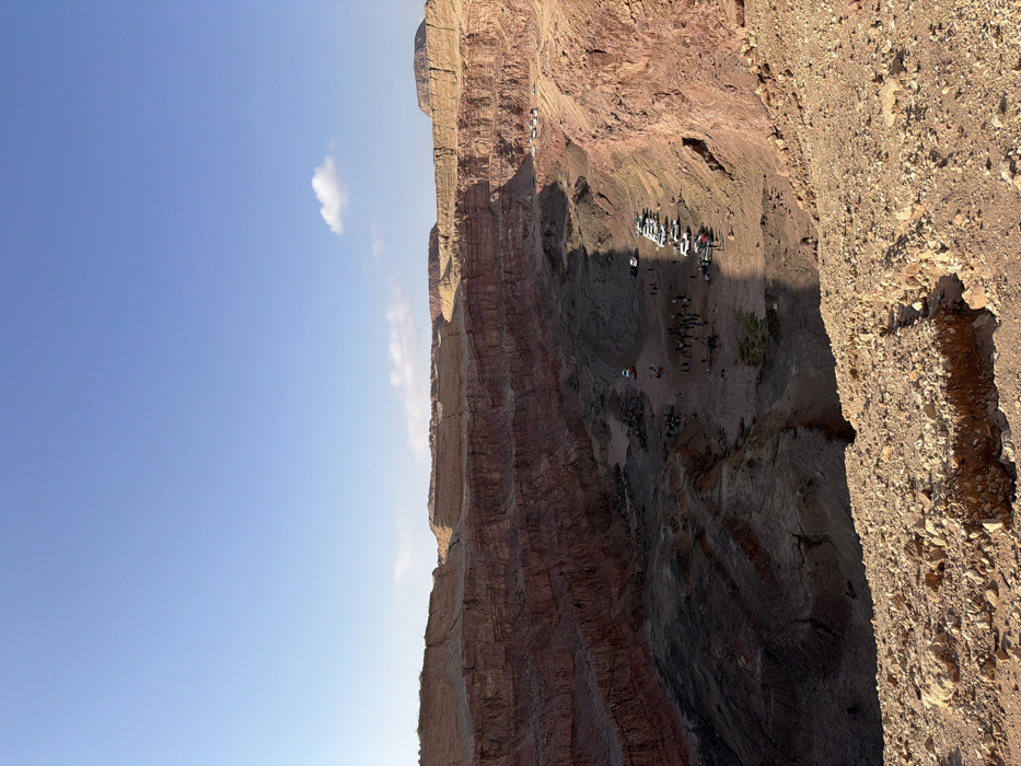 An overhead, wide-angle shot depicts a large, open-pit mine or quarry under a clear, bright blue sky with a few wispy white clouds. The location is within the Hevel Eilot Regional Council, Israel. The pit features steep, terraced walls composed of reddish-brown and ochre rock layers, indicating a desert environment. The ground at the bottom of the pit is uneven, consisting of dark grey and reddish-brown earth and rubble. Approximately two dozen individuals are visible at the bottom of the pit, distributed in several distinct groups, suggesting organized activity. A line of at least twelve white pickup trucks is parked along a sloped section of the pit floor on the right side. Other vehicles, including what appears to be a small white utility truck with an orange light and an excavator-type vehicle, are also present in different areas of the pit floor. A distinct shadow line diagonally bisects the pit floor, indicating strong sunlight from the upper right. The foreground shows a rugged, rocky, light brown terrain consistent with the surrounding desert.