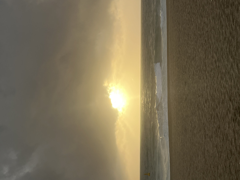 The image displays a coastal scene in Alanya, Turkey, under a heavily overcast sky at either sunrise or sunset. The upper two-thirds of the frame are dominated by dark grey to golden-grey clouds, through which a brilliant, intensely luminous golden light source, presumed to be the sun, breaks through a clearing at the center-left horizon, casting visible rays. The middle ground features the Mediterranean Sea with moderate wave activity, evidenced by white-capped waves approaching the shore. A single yellow, cylindrical buoy is visible floating in the water in the left midground. The foreground consists of a textured, light brown sandy beach, occupying the bottom third of the image. No individuals, animals, or specific activities are observed within the frame.
