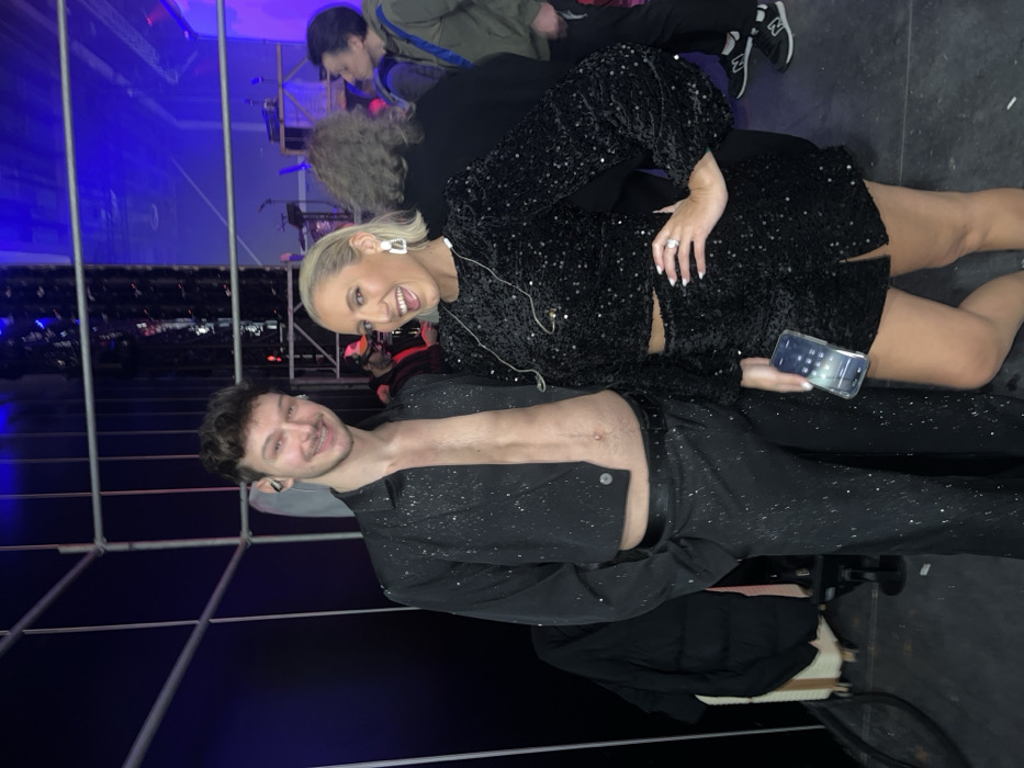A woman with blonde hair, wearing a sparkling black outfit and earrings, smiles next to a man in a sparkly black suit jacket, open to reveal his chest. Both appear to be attending an event or concert, as stadium seating is visible in the background. The woman is holding a phone. Other attendees are seen in the background. The photo is taken from an angle, possibly with a slight rotation.