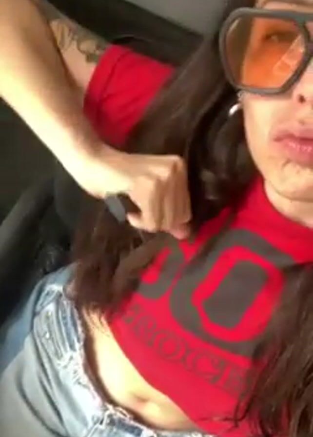 A person with long brown hair and fair skin is centered in the frame, wearing orange-tinted aviator sunglasses, a red crop top with the words "30 PROCES" in gray, and distressed denim jeans. The person is positioned in a black leather car seat, likely the passenger seat, judging by the angle. The person's mouth is open, suggesting they are talking or making a noise, and they are pointing to the word "30" on their shirt. A tattoo is visible on their left arm. The car's interior is slightly visible, showing parts of the black seat. There's a cardboard box in the background. The video is shot from a low angle, looking up at the person.