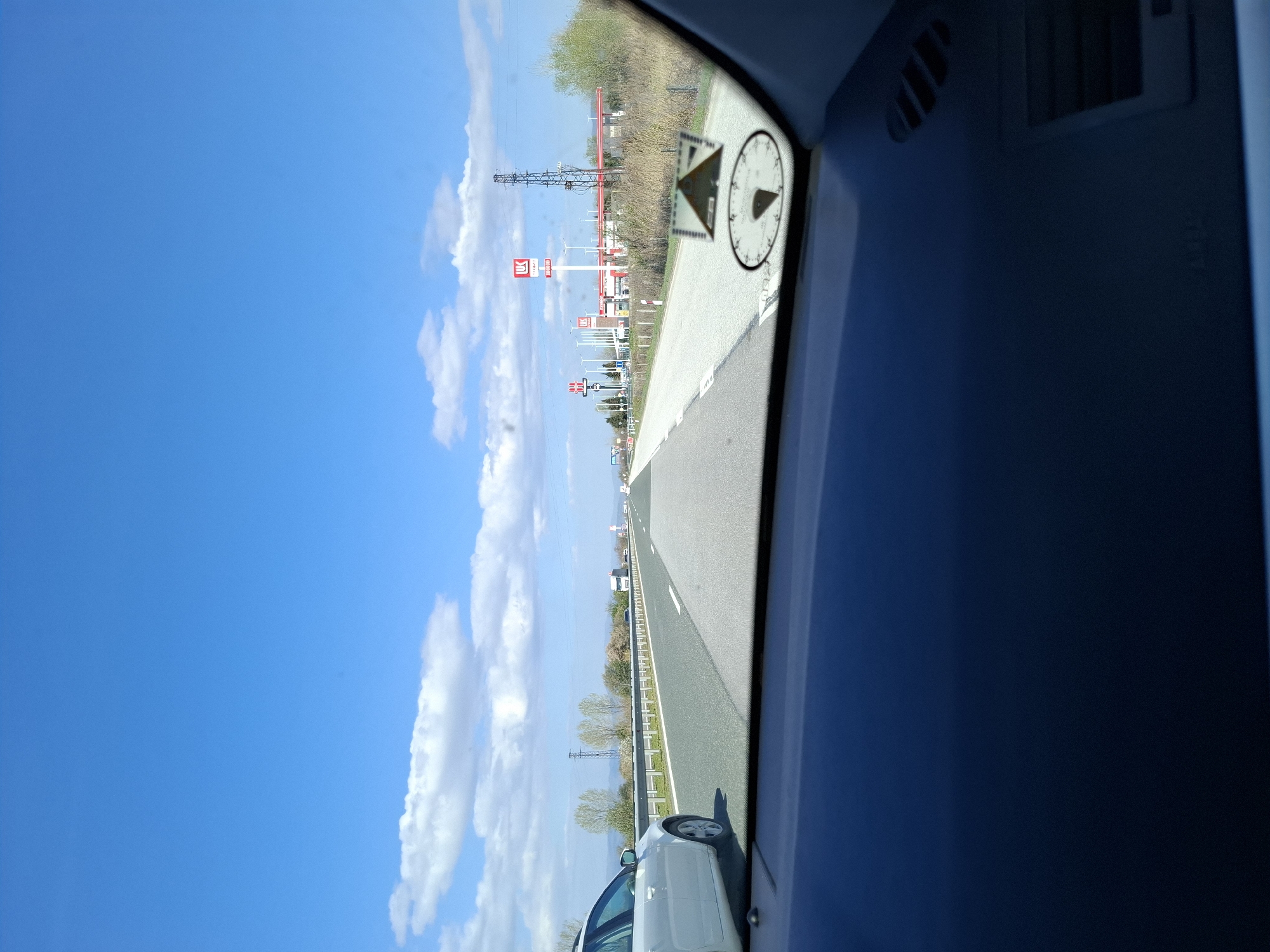 view from inside a vehicle driving on a highway. The location is identified as near Shtarkovo, Bulgaria, based on the signage for a gas station seen in the distance. The sky is blue with scattered white clouds. Another car, white, is visible driving alongside the vehicle from which the photo was taken. A toll sticker and vignette sticker are affixed to the windshield. The interior of the car is visible on the right side of the image. Power lines are present along the highway.