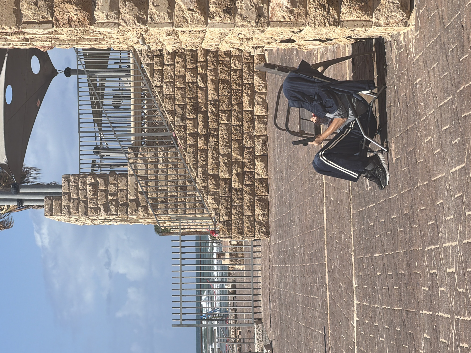 An eye-level, outdoor shot in Tel Aviv, Israel, depicts a person seated on a folding chair on a brick-paved walkway alongside a stone wall and metal railings that overlook the beach