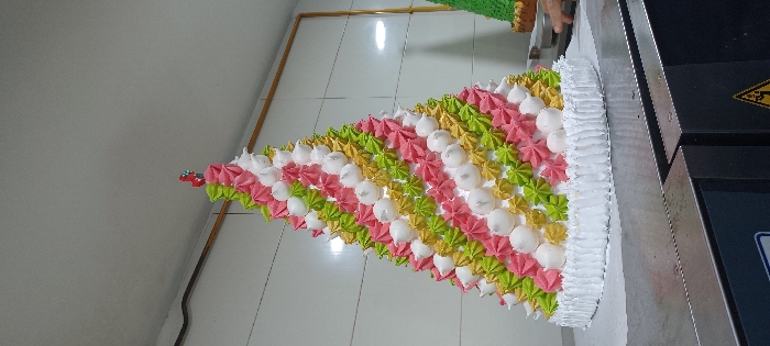 - "A creatively decorated, wedge-shaped cake features rows of white meringue drops, pink and green star-shaped frosting" by FM-GJkLu1, licensed under CC BY 4.0