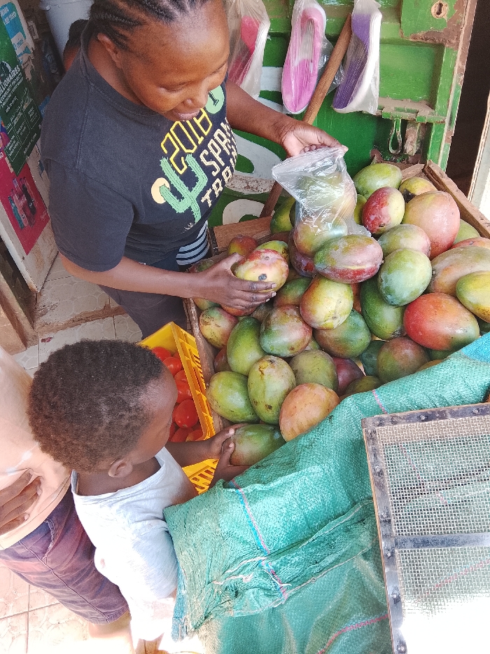 The image displays a market stall scene in Unknown, Unknown, captured from an elevated perspective. An adult female, positioned in the upper center, has dark braided hair and wears a black t-shirt with a partial "2018 SPRING TRAD" graphic and a cactus design, along with dark trousers. She is actively engaged with a large pile of mangoes, holding one in her left hand while her right hand holds a clear plastic bag over additional mangoes. The mangoes, exhibiting varying degrees of ripeness from green to red-orange, are contained within a wooden crate. Adjacent to the mangoes, a yellow plastic crate holds numerous red tomatoes. To the lower left, a young child with short, dark, curly hair, wearing a light-colored t-shirt, stands facing the produce, with their left hand near the mangoes. A partial view of a third person's arm and shoulder is visible on the far left. The background features a green-painted structure, possibly a wall or door, from which two pairs of plastic slippers (one pink, one purple) hang in clear packaging. Further left in the background, advertisements or posters with visible text, including "MILLIONAIRES," are affixed to a lighter surface. The ground is covered with light-colored square floor tiles. In the lower right foreground, a crumpled green woven plastic bag is partially visible, along with a rectangular metal mesh tray.