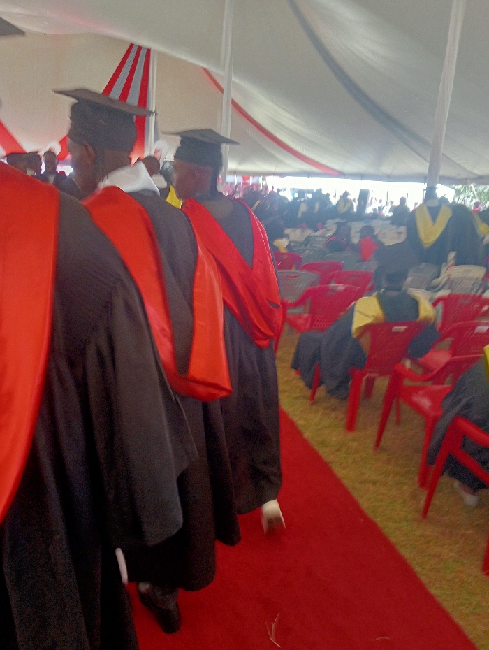 The image depicts a formal event, likely a graduation ceremony, taking place under a large white marquee in Shamenei, Kenya. In the foreground, three individuals are observed from behind, walking forward on a red carpet. They are uniformly dressed in black academic gowns, red stoles, and black mortarboard caps. The individual furthest left displays a white shirt cuff beneath the gown, and black footwear. The central figure wears a white collar over their gown. The figure on the right exhibits white footwear beneath their gown. The red carpet extends into the midground, laid over a ground surface that appears to be grass. To the right of the carpet, multiple rows of red plastic chairs are arranged, some occupied by attendees, others empty with academic gowns draped over them. In the background, numerous other individuals are visible, seated or standing, also attired in black academic gowns, some with red and others with yellow stoles. The marquee structure features internal poles and decorative red and white striped fabric draped along the ceiling. The scene is brightly lit.