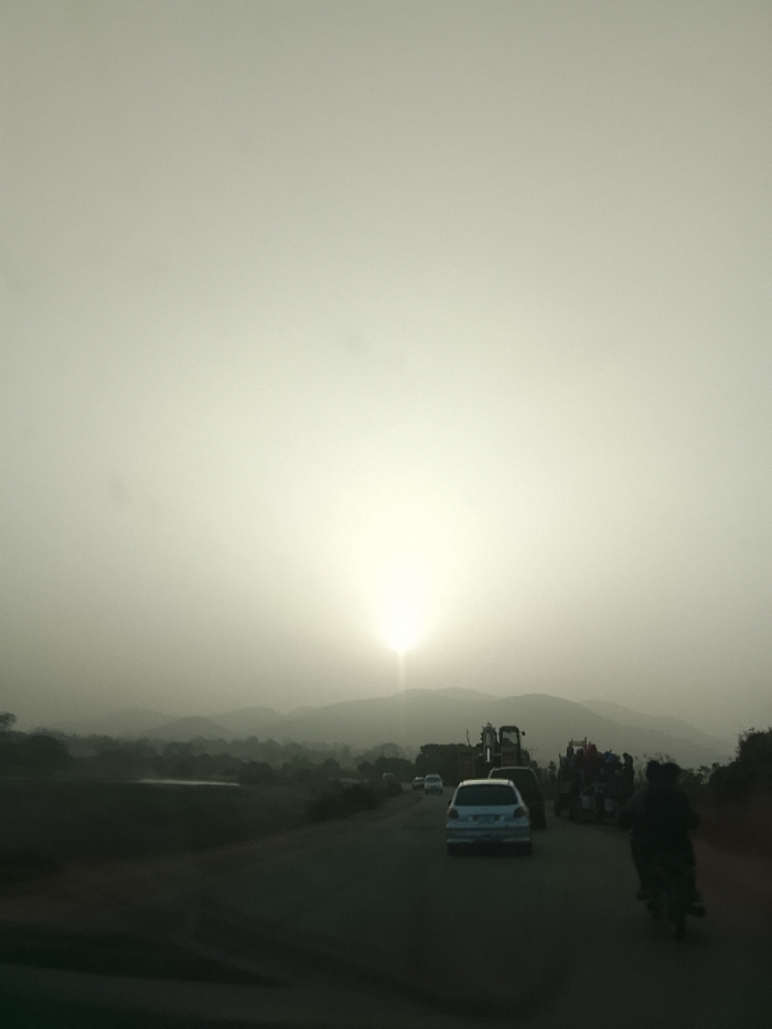 - "The image displays a hazy outdoor scene on a paved road in Dorowa, Nigeria, likely during sunrise or sunset, given the low position of the sun on the horizon" by FM-Zezex1, licensed under CC BY 4.0