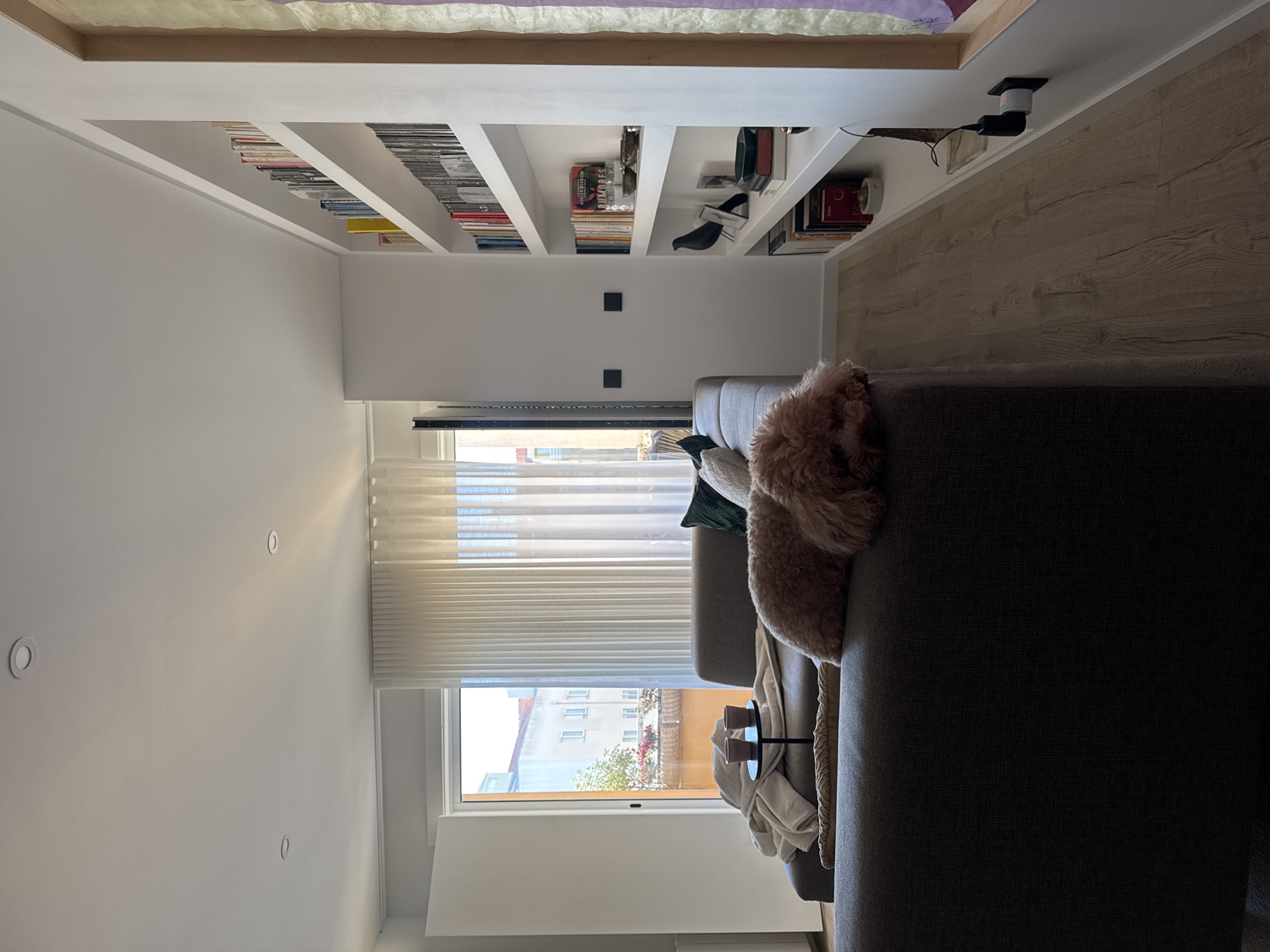 The image depicts the interior of a residential living space in Vila Nova de Gaia, Portugal. A large, dark gray L-shaped sectional sofa occupies the foreground and midground. A light brown, curly-haired dog is resting on the main section of the sofa, positioned with its head down. On the sofa, a small black circular side table holds two terracotta-colored cups, and a light-colored blanket is draped nearby. One dark green and one cream-textured pillow are visible on the sofa. To the left, an open white door leads to a balcony with an orange railing and visible potted plants displaying red flowers. Beyond the balcony, a multi-story white building with red tile roofs, characteristic of Portuguese architecture, is visible. Sheer white vertical blinds cover most of the balcony opening. The white ceiling features three recessed circular light fixtures. Along the right wall, a white, floor-to-ceiling built-in bookshelf unit is filled with numerous books and decorative objects, including a black crow figurine, a framed picture, and several small bowls. Two black square wall switches are mounted on the white wall between the sofa and the bookshelf. The floor is light-colored wood laminate. A partial view of a framed artwork with purple and yellow elements is visible on the far right edge of the frame, adjacent to the bookshelf. A black power adapter is plugged into an outlet at the base of the bookshelf on the right. No human subjects are present in the scene.