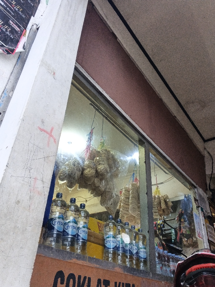 The image displays an upward-angled view of a commercial storefront window, likely belonging to a small shop or convenience store, in Pinnwe, Myanmar. A large, light-grey concrete pillar occupies the left side of the frame, marked with a red 'X' and numerous fine scratches. A black and white poster, partially visible on the upper left of the pillar, contains text including 'YOUR' and 'BLACK'. Through the storefront glass, a row of clear plastic bottles labeled 'CRYSTAL' or 'CRYSTALIN', filled with a clear liquid, are visible on a lower ledge. Above these, multiple bundles of light-colored, dry packaged snacks are suspended by strings or hooks. These bundles vary in size and are contained within clear plastic or tied together, presented for sale. A bright internal light source inside the shop creates reflections on the window. Above the window, a horizontal reddish-brown fascia panel is present, topped by a light-colored soffit or ceiling structure with dark linear detailing. A small section of a red object, consistent with a motorcycle component, is visible in the lower right foreground. No individuals are present in the scene.
