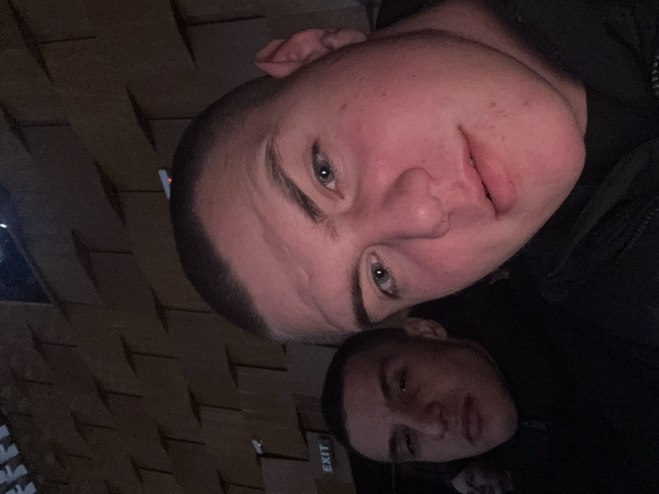 The image depicts two young adult males situated in the dimly lit auditorium of the Drama and Puppet Theatre "Vasil Drumev" in Shumen, Bulgaria. The primary subject, a male with short dark hair and light blue eyes, is in the foreground, looking directly at the camera with a neutral expression. His face shows a reddish hue from ambient lighting. Partially obscured behind and to his left is a second male, also with dark hair and eyes, looking towards the camera with a neutral to slightly stern expression. Both subjects are wearing dark clothing. A third, indistinct individual is visible in the far left background. The background wall features a distinctive pattern of repeating, horizontally oriented, rectangular protrusions, indicative of acoustic paneling. An illuminated "EXIT" sign, displaying text in English, is mounted on the wall to the left of the second male. The overall environment suggests an indoor public venue during an event or performance.