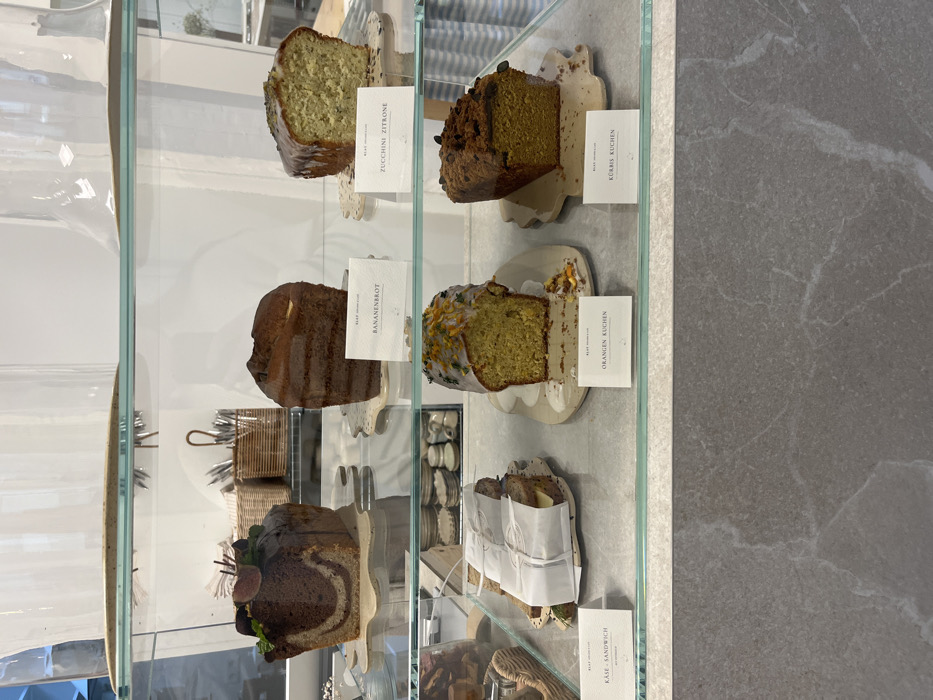 The image displays a two-tiered glass display case inside a café located at Steinstraße 20, 67655 Kaiserslautern, Germany, identified by "BLAU Hauscafé" branding on product labels. The case features various baked goods and a sandwich, each presented on an irregularly shaped beige or cream ceramic saucer. On the upper shelf, from left to right: 1. A marbled chocolate and plain loaf cake, partially sliced, topped with a dark glaze, two small figs, and mint leaves. 2. A whole, dark brown loaf cake, labeled "BANANENBROT" (Banana Bread). 3. A light green-yellow loaf cake, partially sliced, covered with a white glaze and green sprinkles, labeled "ZUCCHINI ZITRONE" (Zucchini Lemon). On the lower shelf, from left to right: 1. A "KÄSE - SANDWICH" (Cheese Sandwich), presented as two halves on brown bread, wrapped in white paper and secured with twine. 2. A bright yellow-orange loaf cake, partially sliced, featuring a white glaze and visible orange zest, labeled "ORANGEN KUCHEN" (Orange Cake). 3. A darker orange-brown loaf cake, partially sliced, topped with crumbs and pumpkin seeds, labeled "KÜRBIS KUCHEN" (Pumpkin Cake). The background behind the display case is a white wall, where two woven baskets containing cutlery and other indistinct small kitchen items are visible. The counter beneath the display case is a grey marbled surface. The scene is brightly lit, and no individuals or explicit actions are depicted.
