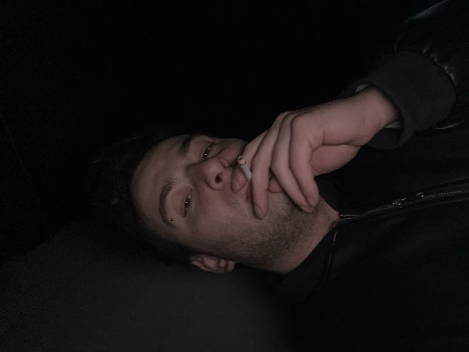 A single adult male is depicted in a low-light, close-up portrait, presumably located in the city of Stefan Karadja, Bulgaria. The subject, with dark hair, visible stubble, and a piercing above his left eyebrow, is wearing a dark, possibly leather, zipped jacket. He is holding a lit cigarette between the index and middle fingers of his right hand, positioned near his mouth, with smoke faintly visible and the tip glowing orange. His gaze is directed towards the camera. The background is predominantly dark, providing minimal environmental detail beyond the subject.