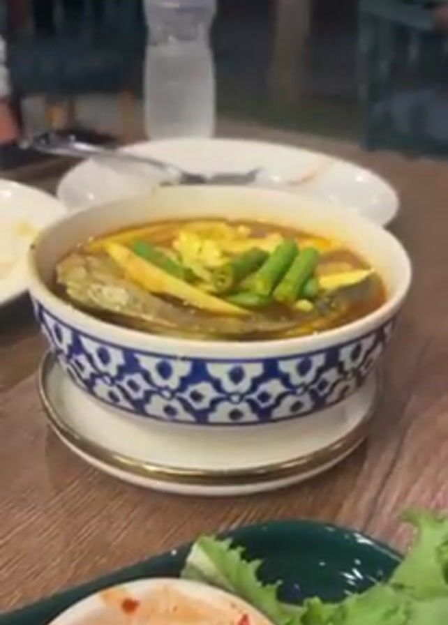 - "A person removes the lid from a blue and white ceramic bowl revealing fish in a yellow broth, green beans, bamboo shoots and cauliflower" by FM-01ta63, licensed under CC BY 4.0