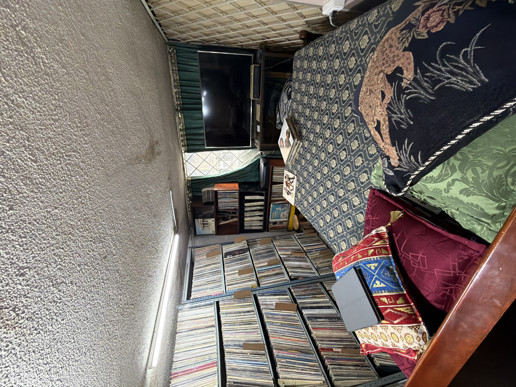 The image depicts the interior of a room, likely a residence, within the city of Bogota, Colombia. The precise location within Bogota is not discernible from the provided visual information. The room features a textured, off-white popcorn ceiling with a visible brown liquid stain near the back wall. Two fluorescent tube light fixtures are mounted on the ceiling. The left wall is dominated by multiple grey metal shelving units densely packed with hundreds of vinyl records, arranged vertically. Several brown cardboard dividers are placed among the records on these shelves. In the back-left corner, additional wooden bookshelves also contain vinyl records. A small, light-colored wooden stool is positioned near these shelves. The back wall includes a window with a diamond-patterned security grille visible behind dark green pleated curtains. Below the window, a large, black flat-screen television rests on a dark wooden stand. A small, gold-colored soundbar or speaker is placed beneath the television. A bed with a dark blue and gold/beige patterned bedspread occupies the center-right of the room. A stack of vinyl records is laid horizontally on the bedspread. In the foreground, on what appears to be part of the bed or a nearby bench, there is a collection of decorative pillows. These include a red, blue, and beige geometrically patterned pillow topped with a dark grey tablet or small laptop, a solid dark red pillow with an embossed pattern, a green patterned pillow, and a black pillow featuring an embroidered gold feline and floral design. The right wall is covered with a light-colored, possibly woven or lattice-patterned material, and a white electrical outlet with a plugged-in cord is visible. No individuals are present in the scene.