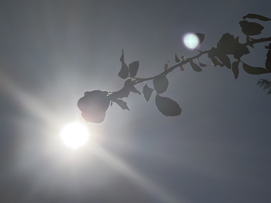 A solitary rose plant, depicted as a dark silhouette, occupies the central and right portions of the frame, extending vertically from the lower edge. At its apex, a closed or partially open rose bud is visible. The stem is adorned with multiple leaves and discernible thorns. The scene is strongly backlit by a brilliant, circular white light source, identified as the sun, positioned in the upper left quadrant. This intense light creates pronounced sunbeams radiating diagonally downwards and causes significant lens flare, including a distinct, circular, light blue/white aberration in the lower right quadrant. The background consists of a uniformly muted gray-blue sky, appearing featureless due to the backlighting. Faint, dark, out-of-focus elements, consistent with ground foliage, are subtly present at the bottom edge. This image captures a rose under direct sunlight in Armavir, Armenia.
