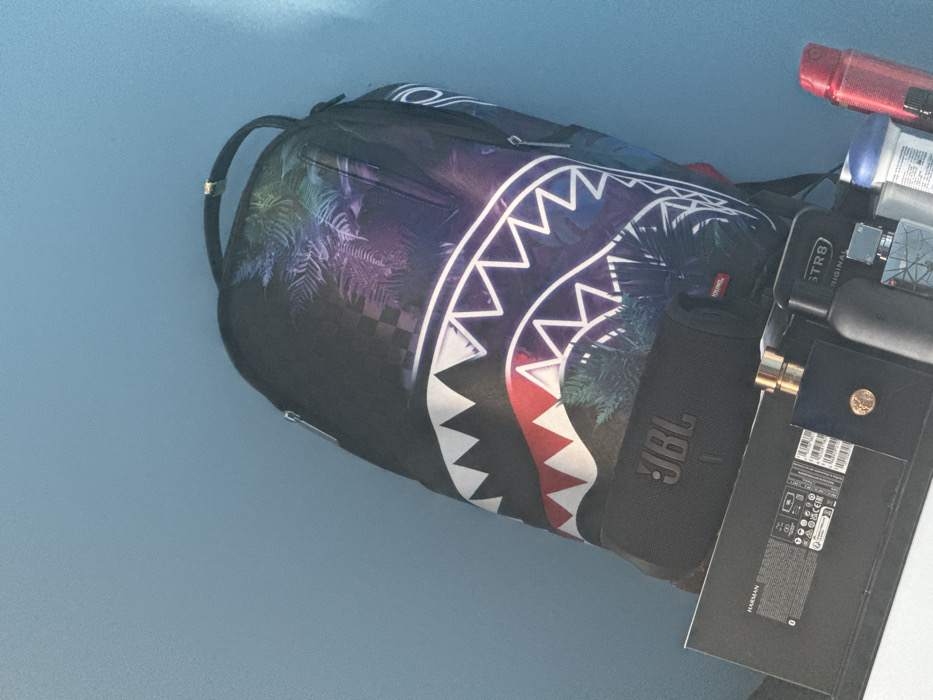 The scene is an interior shot taken in Burgas, Bulgaria, displaying a collection of personal items on a dark, flat surface against a light blue wall. A black backpack with a prominent graphic featuring a shark's mouth design (white teeth, red gums) and a pattern of purple and green tropical leaves and checkered elements stands upright, leaning against the wall. Positioned directly in front of the backpack is a black JBL portable speaker. To the left of the speaker, a black rectangular box, possibly for electronic equipment, bears the "HARMAN" logo and various product information labels. To the right of the speaker, a cluster of bottles and containers is arranged. These include a dark blue bottle with gold accents, identifiable as Versace Eros cologne; a black bottle labeled "STR8 ORIGINAL"; a white container with a blue cap; a silver bottle; and a red spray bottle. No individuals are present, and no actions or interactions are depicted. The lighting is consistent with an indoor setting.