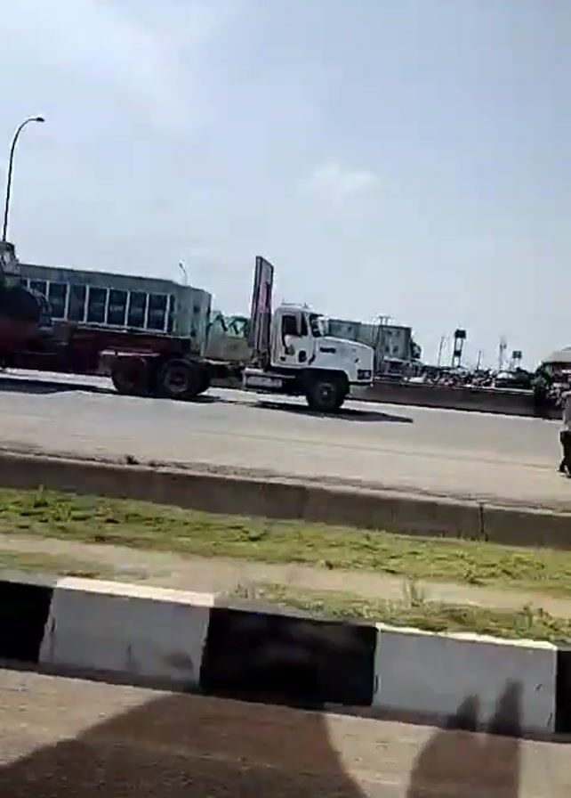 lowboy trailer being pulled by a white cab-over truck driving on a road, carrying a large excavator or backhoe with an additional smaller trailer attached. The road runs parallel to a green grassy area with a black and white curb. The camera angle suggests it is filmed from a moving vehicle. As the vehicles pass, individuals appear to be crossing the road. A man with a suitcase, then two men dressed in red shirts are seen. A woman with a black purse is also seen in the same area. Various vehicles drive on the road in the opposite direction to the camera's movement. The sky is partly cloudy, and the environment appears to be a moderately busy urban area.