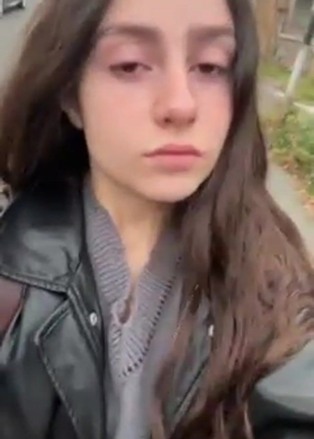 young woman walking outdoors. She has long brown hair and is wearing a black leather jacket over a gray knitted top. Her expression is neutral as she looks around, holding the camera at a low angle. The background shows a residential street with buildings and parked cars, suggesting an urban environment. The sky appears overcast. The camera movement is unsteady due to the woman walking while filming.