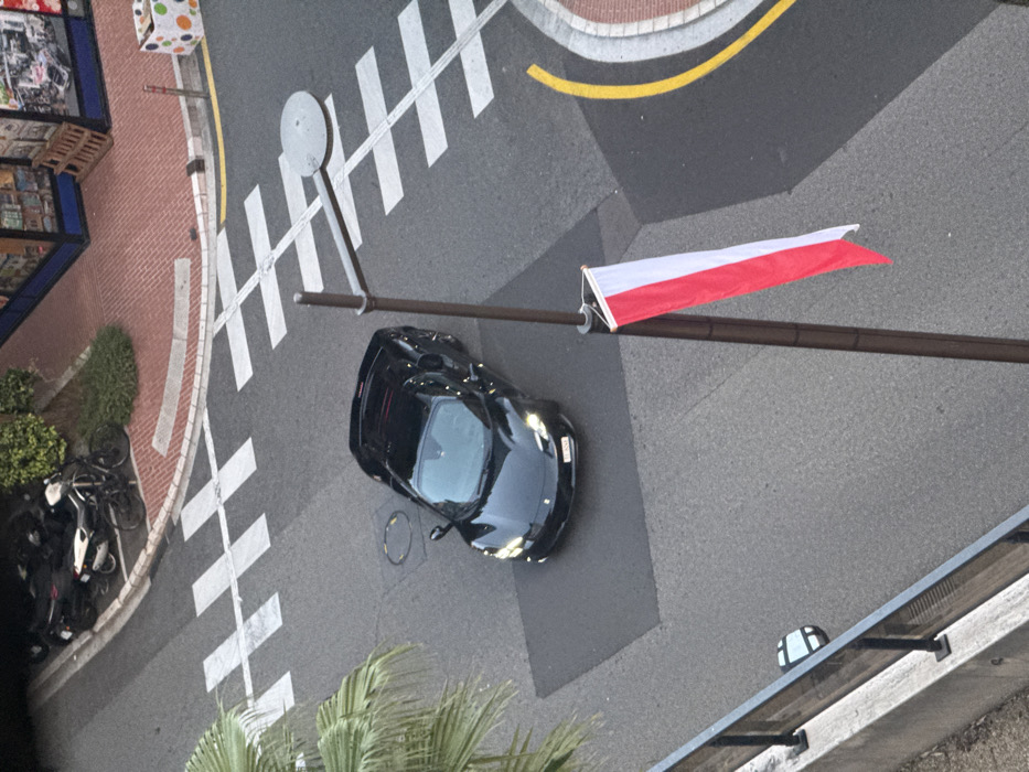 From an elevated vantage point, a black sports car is parked on the street near a zebra crossing. A flag, red and white, is affixed to a pole extending over the street. Adjacent to the zebra crossing, there is a shop, and a row of bicycles are parked near it. Palm trees are visible in the foreground, adding a touch of greenery to the urban scene. A yellow line marks the road, indicating parking restrictions or lane separation.