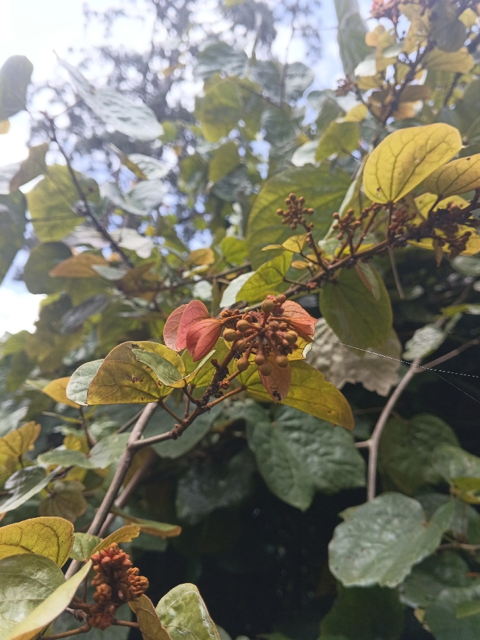 A close-up shows a tree branch laden with heart-shaped leaves in hues of green, yellow, and reddish-brown. Clusters of brown buds are prominent, some exhibiting a reddish tint on their outer petals. A delicate spiderweb spans the right side of the frame, adding a touch of fragility to the scene. The background reveals additional foliage, slightly blurred, with glimpses of the sky visible through the leaves.