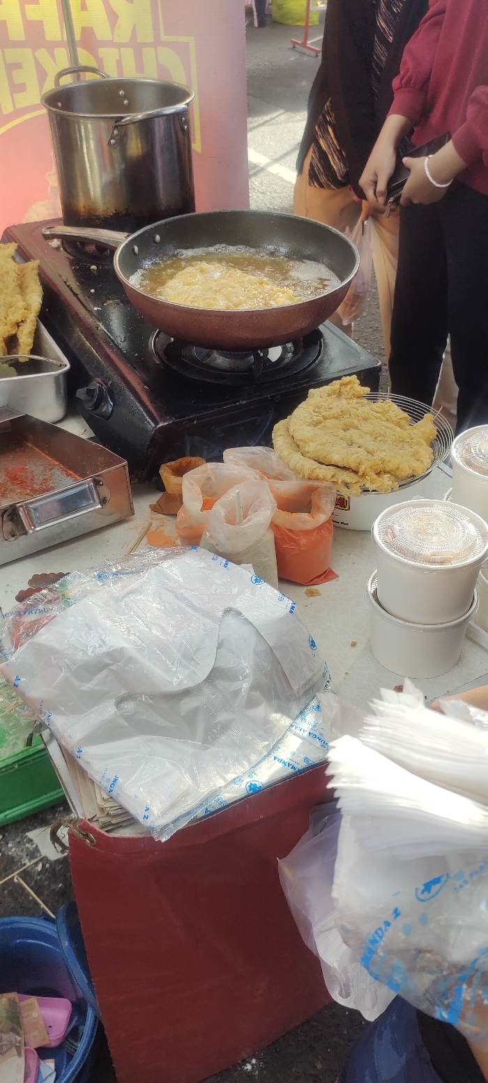The scene takes place at a street food stall in Sidoarjo, Indonesia, located at the coordinates -7.442 latitude and 112.705 longitude. A large pot of oil is heating on a portable stovetop, and a frying pan is submerged in the oil with a large fried food item in it. A stack of fried food is on a table in front of the stove, and there are several small containers of condiments and several plastic bags nearby. Three people are present, two women and a man. One of the women is standing beside the stovetop, the other is standing on the side of the table, and the man is sitting on the ground. There are also several other items on the table, including a small red box, a paper container, and a plastic bag. The ground is covered in dirt and the back of the image reveals a pink sign with black lettering that reads "KRAF CHICKEN". A white plastic bag is directly in front of the stovetop with "MANDIA" and "42" printed on it. A large plastic bag with "MANDIA" written on it is partially off-frame in the lower right of the image, and there is a stack of white paper towels partially visible. The food being prepared is being fried and sold in a street food stall in Sidoarjo, Indonesia.