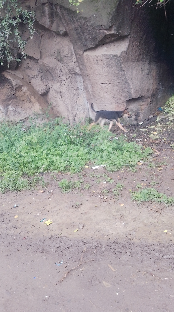 A dog with dark fur and light legs walks past a large rock formation covered in greenery. The dog appears to be moving from left to right, its tail raised. The background features the rock face, partially shaded. The foreground consists of a muddy ground surface with scattered debris and sparse vegetation. The overall scene seems to be an outdoor, possibly unkempt, environment.