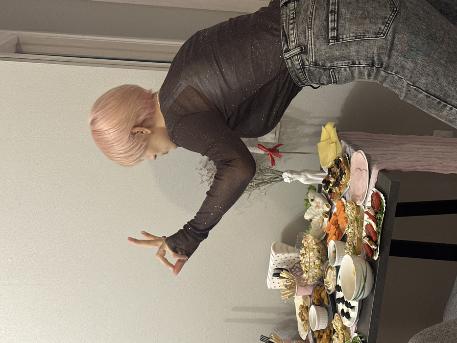An indoor scene in Lyubertsy, Russia, depicts an individual leaning over a table laden with food. The person, with short, pink-dyed hair, faces right and wears a sheer, dark, glitter-speckled long-sleeved top over a dark bra, paired with faded gray high-waisted jeans. Their left arm is raised, with the index finger and thumb extended upwards, forming a gesture. A ring is visible on the extended index finger. The table, partially covered by a light pink, crinkled fabric runner, holds a variety of appetizers and snacks. These include a large glass bowl of salad, multiple tartlets with diverse toppings, small white ramekins containing fried items, bowls of dips or spreads, sliced carrots, plates with sliced ham and cheese, and a dish with tomatoes and greens. Utensils and skewers are present in a pink container and a heart-patterned decorative box. A white decorative object resembling a classical bust, holding dried flora, stands on the table alongside a stick with a red bow attached. The background consists of a plain, light-colored wall, with a white door frame visible on the right.