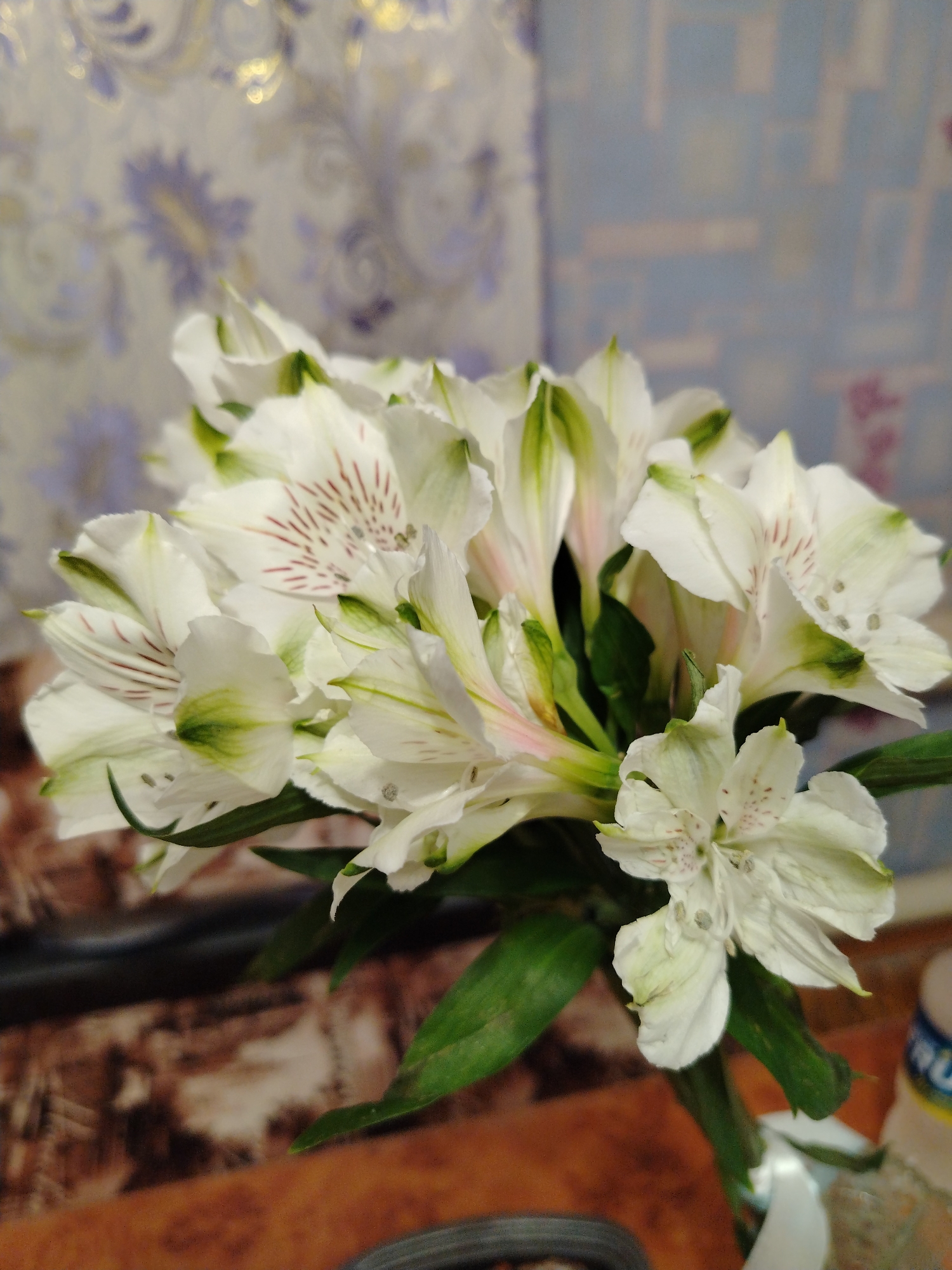 - "The image displays a close-up of a bouquet of white Alstroemeria flowers, positioned indoors in a residential setting in Kuyeda, Russia" by FM-J8Ma03, licensed under CC BY 4.0