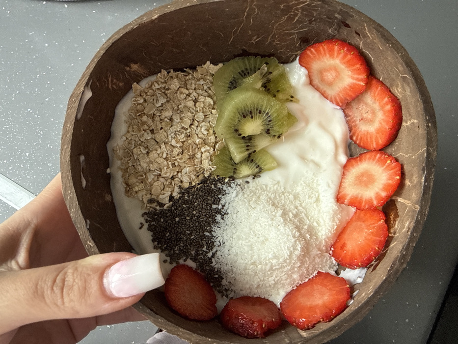 The scene is situated in Dobrich, Bulgaria. The image presents a close-up, top-down view of a decorative food bowl held by a light-skinned hand. The bowl, appearing to be crafted from a natural coconut shell, contains a white, creamy base, likely yogurt, topped with various ingredients arranged in distinct sections. In the upper right quadrant are rolled oats. Adjacent to them on the upper left are chia seeds, followed by a section of finely shredded white coconut. Below the oats and adjacent to the coconut are several slices of kiwi fruit. Along the bottom and lower-left rim of the bowl are multiple bright red strawberry slices. The hand, visible in the upper left, grips the bowl with the thumb and index finger. The visible thumbnail features a pink-to-white ombré manicure. The background shows a portion of a speckled light-gray or white countertop surface.