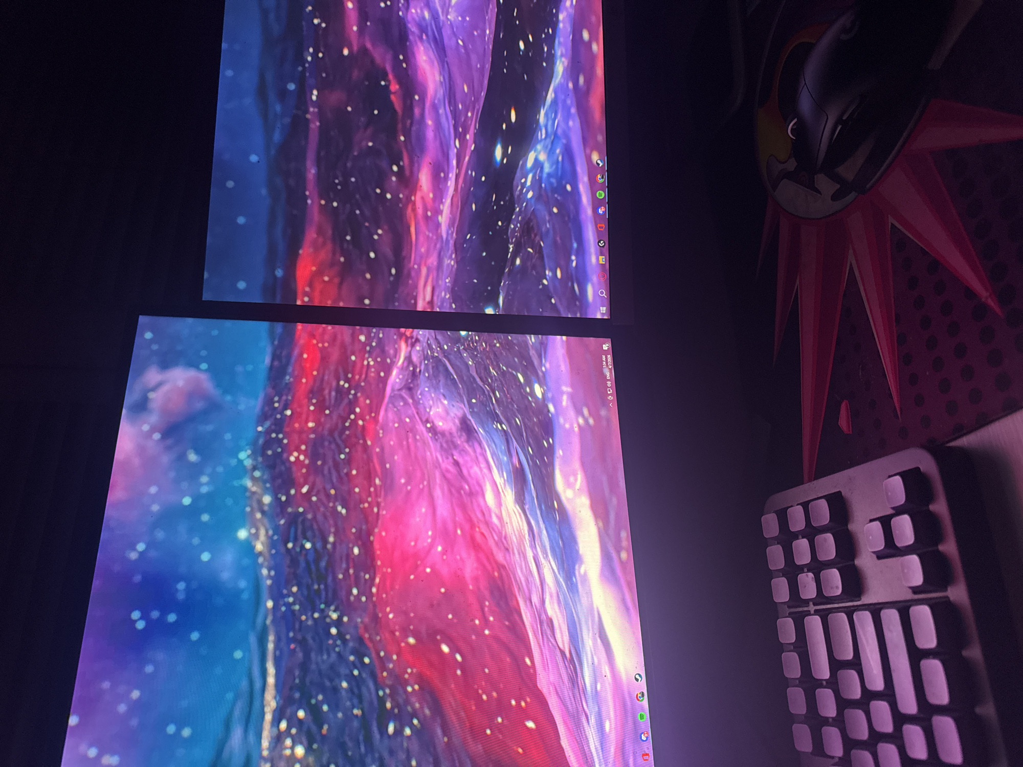 desk setup with two computer monitors displaying a vibrant, abstract space-themed wallpaper