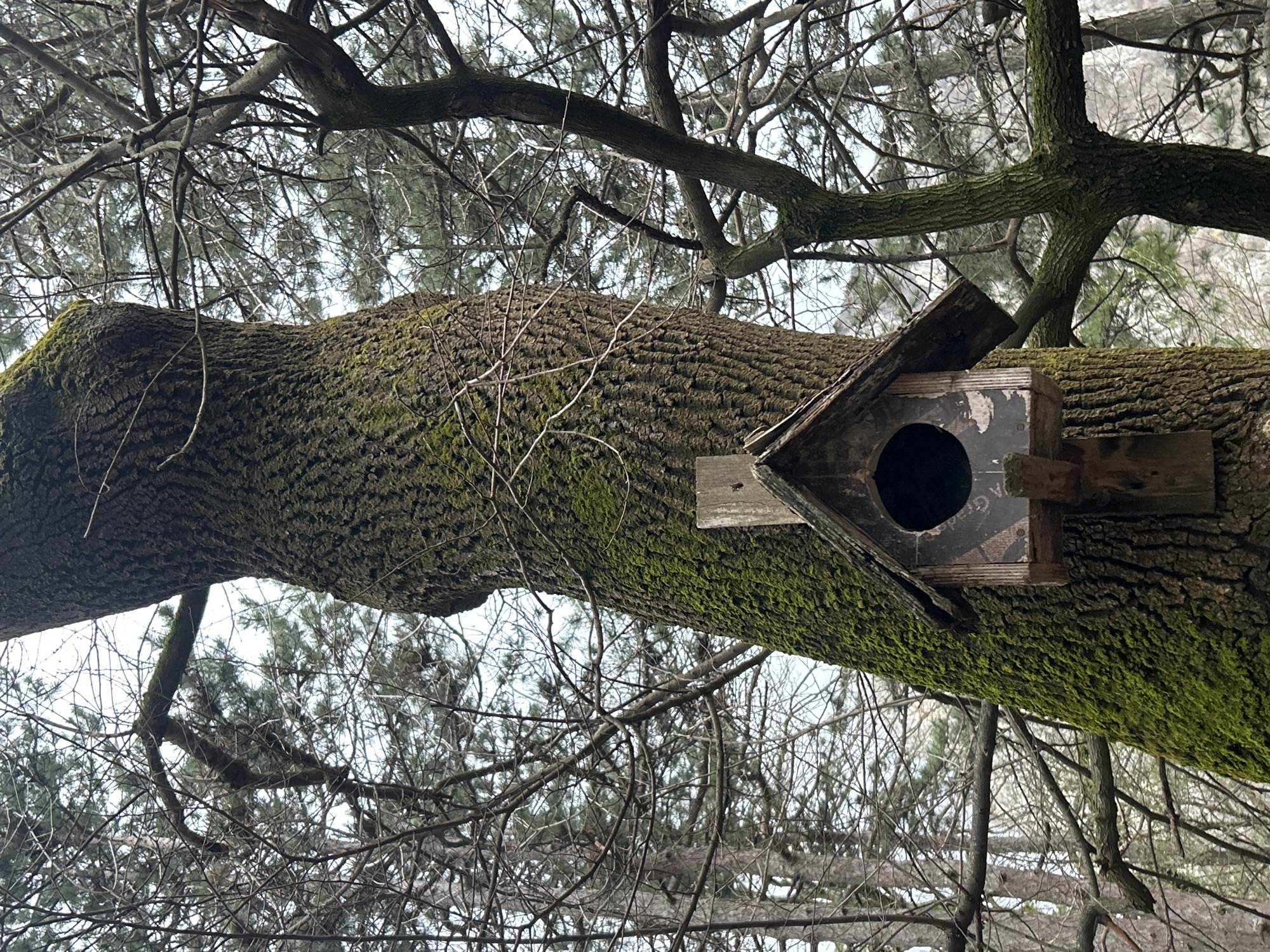 birdhouse attached to a thick, moss-covered tree branch