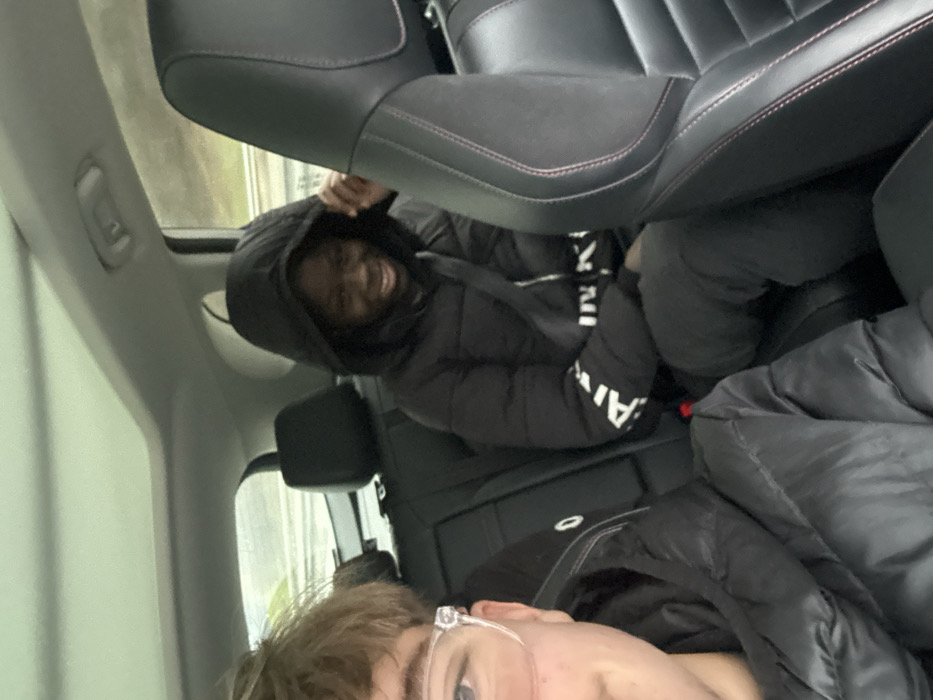 The image displays an interior view of a moving vehicle, reportedly in Eckartswiller, France. A person is partially visible on the left in the foreground, wearing a black puffer jacket and clear-framed glasses, with light brown hair, suggesting they are capturing the photograph. In the midground, seated in the rear right passenger seat, is an individual with dark skin, wearing a black hooded puffer jacket with the hood up. This person is smiling broadly towards the camera, showing teeth, and has their left hand raised near their head. A seatbelt is secured across their chest. The text "ARMANI" and "IN K" is partially legible on the right sleeve of their jacket. The car's interior features dark-colored seating, with visible red stitching on the front right seat. A sunroof is present in the ceiling. The environment outside the vehicle, seen through the windows, is blurred with tones of green and grey, indicating motion on a road or highway, with a guardrail faintly discernible.